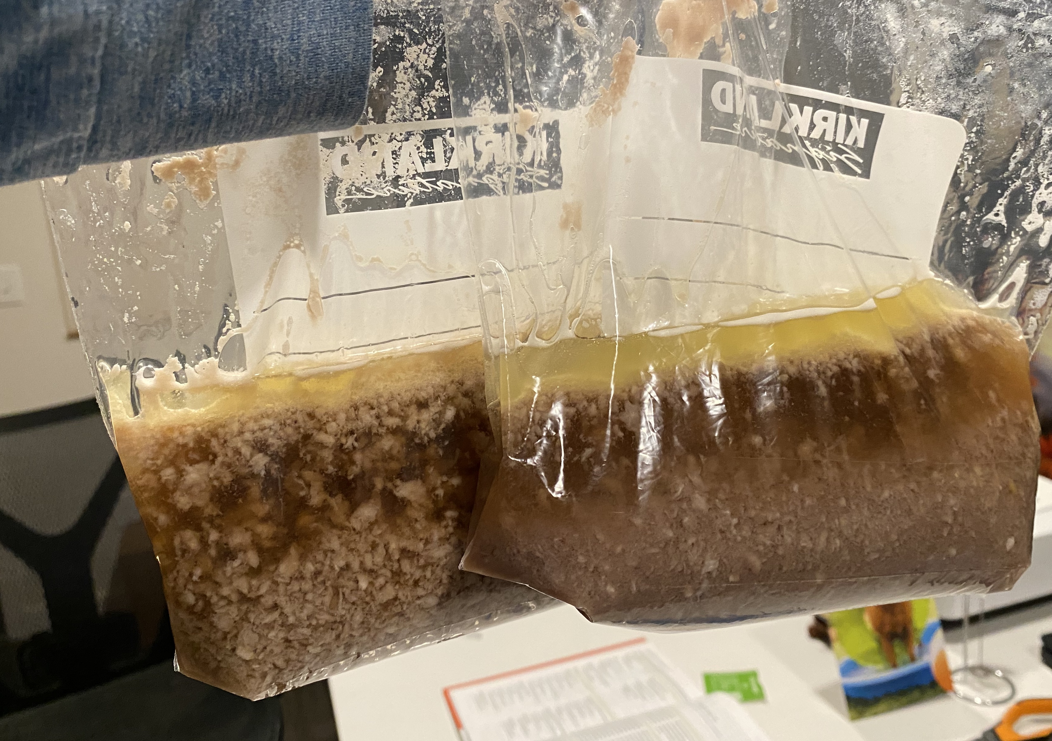 I took two plastic bags and placed a hamburger patty in each with some water. In one of them I put the super enzyme and placed them both into a a 98.6ºF water bath for an hour to simulate body temperature breakdown. As you can see below, it looks like this stuff works pretty well at breaking down the burger! Cool!